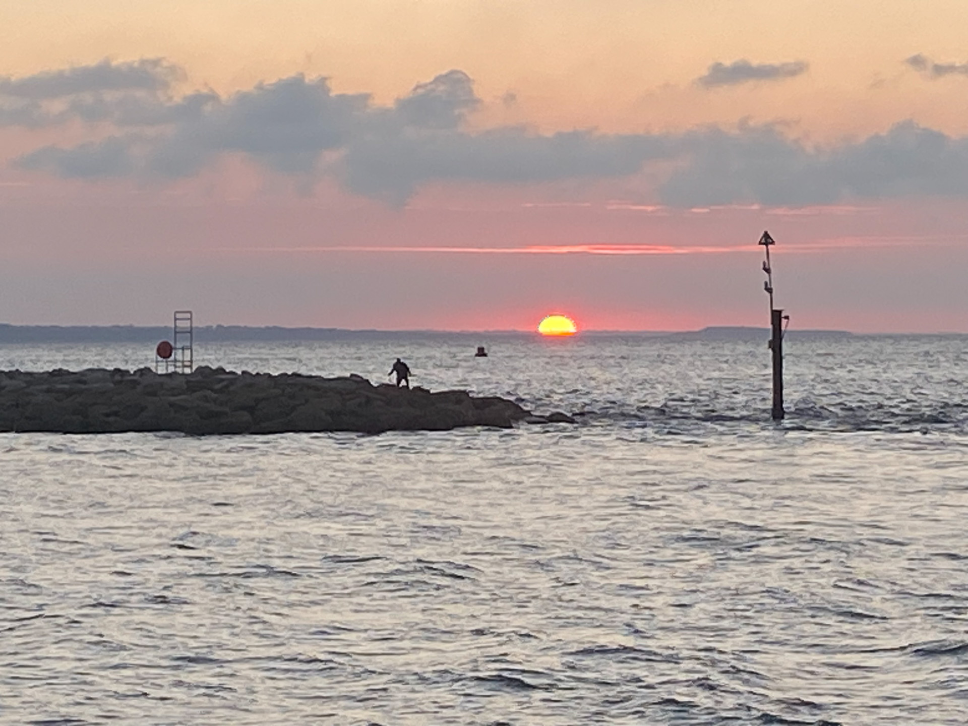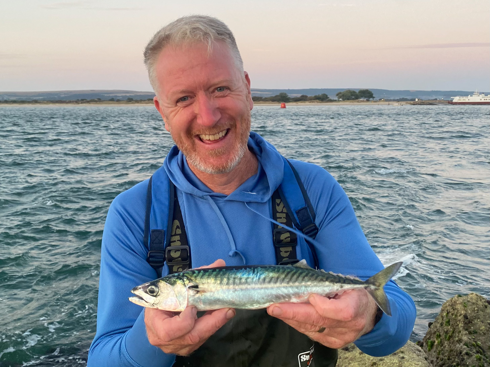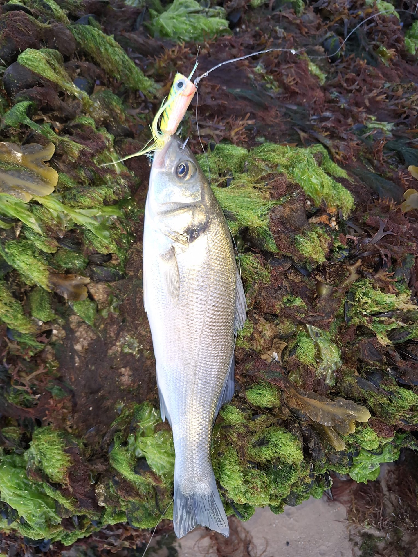 14 bass, 3 pollack, and 1 mackerel were caught. A beautiful sunrise, gentle warm south east wind and some wave on the water coupled with a strong spring flood tide made an interesting morning.