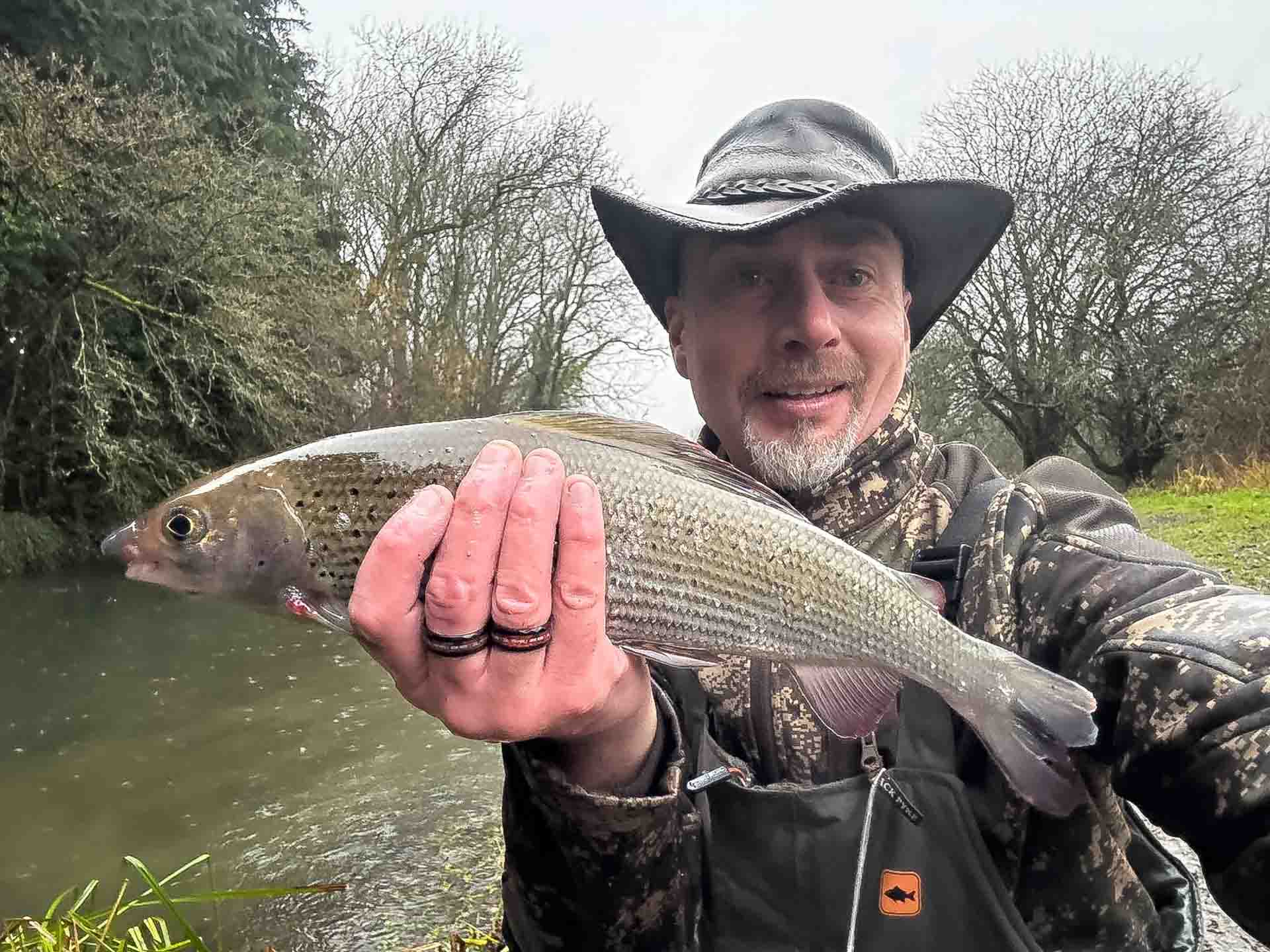 In total,12 grayling were landed, a chub by Stuart Smith, and 29 accidental by-catches of hefty brown trout, and one salmon kelt. The challenge was to get to the grayling before the large head of over-wintered brown trout gobbled up anything that moved. The grayling tended to be in the deeper pools and were mainly taken by trotting maggots and some sweetcorn.